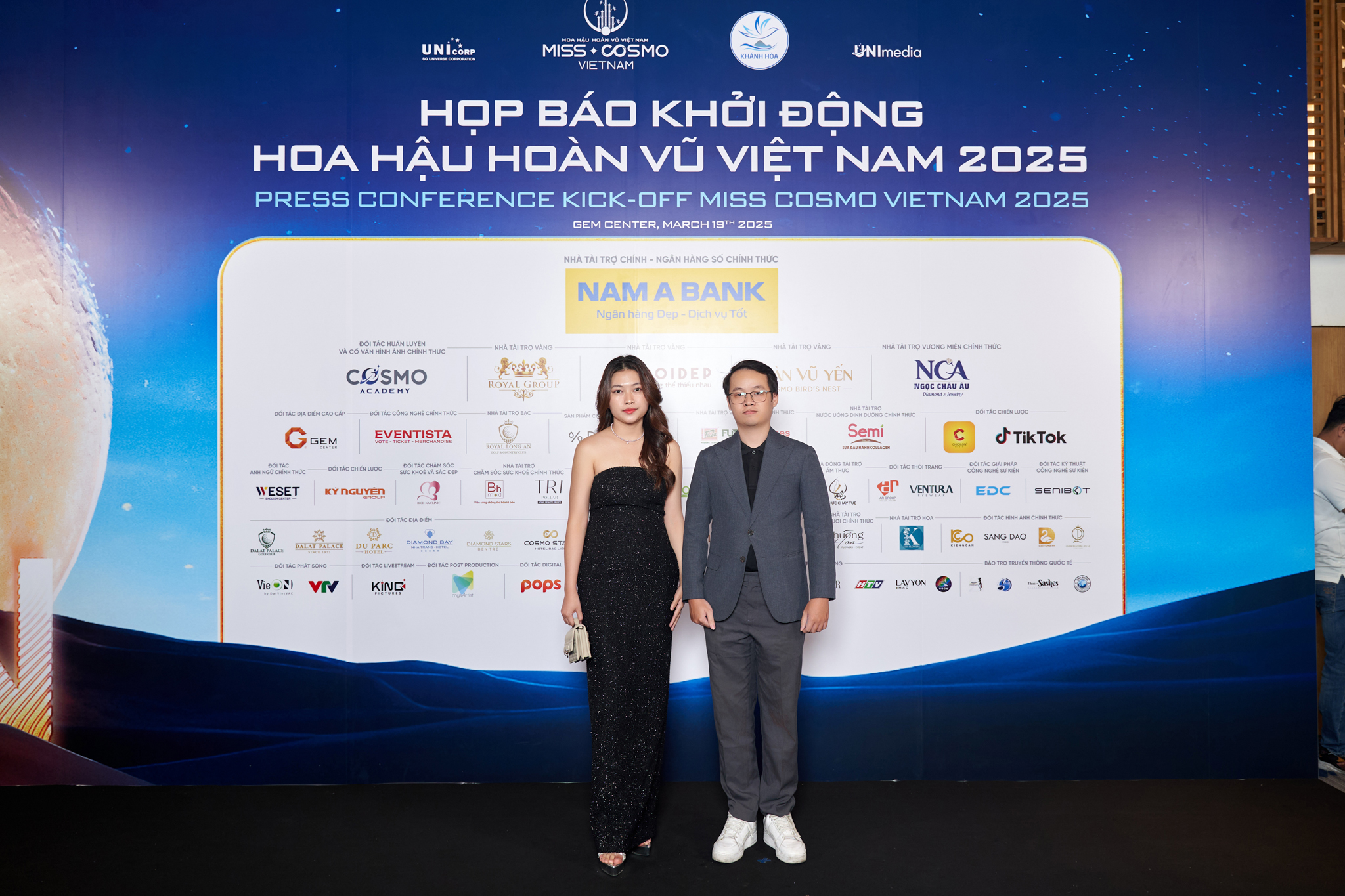 Đại diện Eventista, bà Nga Đoàn – CMO & Co-founder Eventista và ông Nguyễn Mạnh Toàn – CEO & Founder Eventista tại sự kiện Họp báo Khởi động Hoa Hậu Hoàn Vũ Việt Nam 2025 – Miss Cosmo Việt Nam 2025