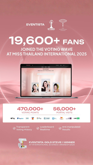 Miss Thailand International 2025 diễn ra với chiến dịch bình chọn số sôi động, thu hút hơn 19.600 người tham gia. Với vai trò Đối tác Công nghệ & Cổng Bình chọn, Eventista mang đến trải nghiệm minh bạch, real-time và thúc đẩy tương tác mạnh mẽ.